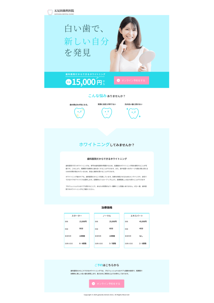 ランディングページ制作 2025年10月17日 最終更新日時 : 2025年12月4日 mika.lucky8 【製作時間】20時間【使用ソフト】Figma【担当業務】デザイン・実装【意識した亊】「ホワイトニング・女性」という目的・ターゲットを明確にして制作しました。